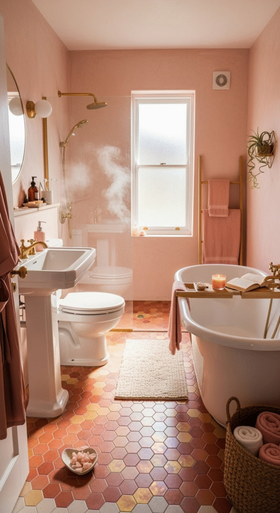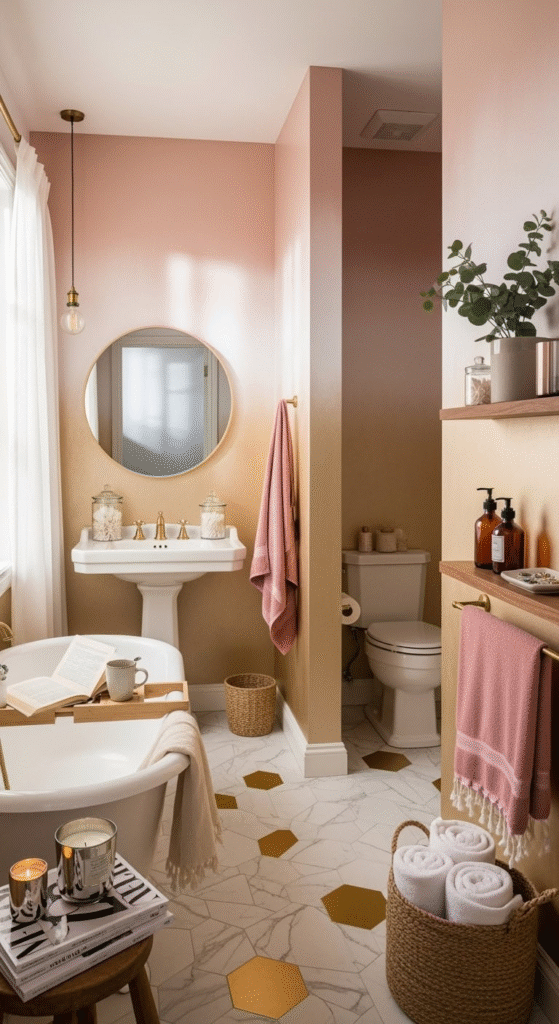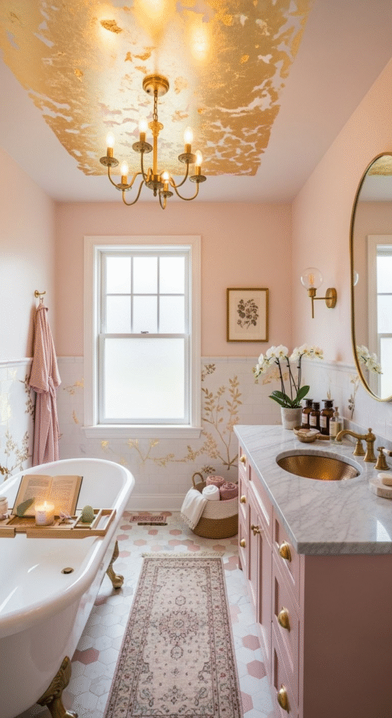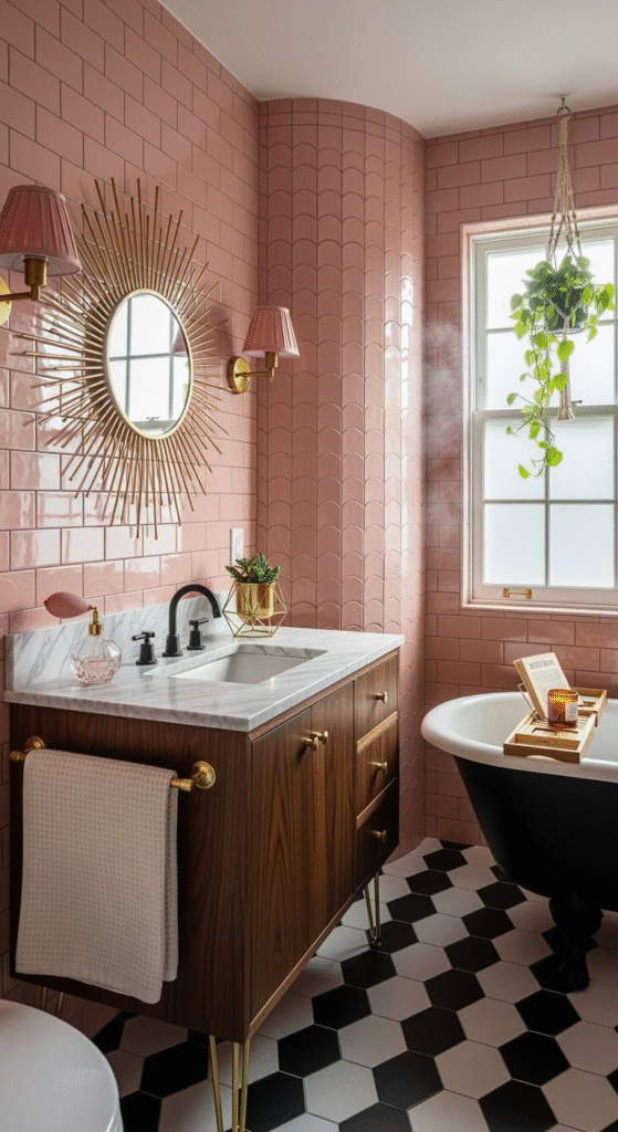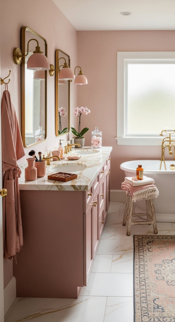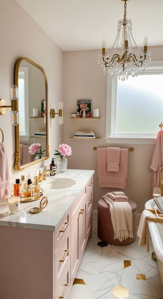 Channel the opulence of the 1920s in a subtle way. Incorporate Art Deco motifs through gold hardware with geometric patterns, a vanity with fluted details, or black and white geometric floor tiles paired with the pink and gold palette. A velvet pink pouf or a small stool adds a layer of plush texture.