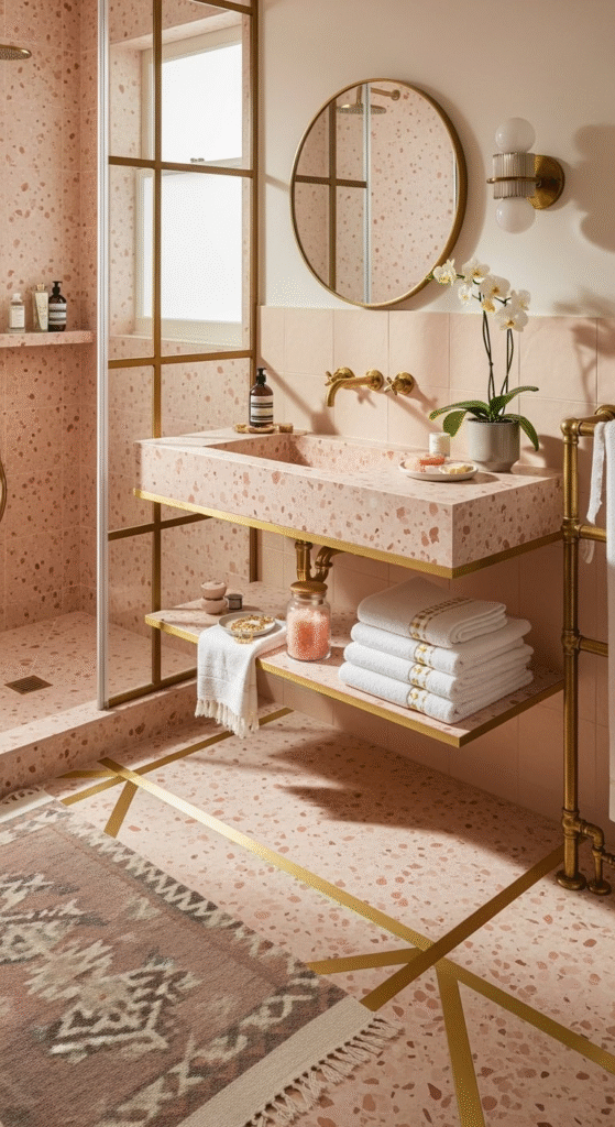 Bring the “wow” factor from the walls down to the floor with pink terrazzo. Modern terrazzo, with its chips of marble, quartz, and glass set in a pink or neutral base, is durable, easy to clean, and incredibly chic. It adds a playful, artistic element that grounds the space and ties the pink and gold elements together seamlessly.