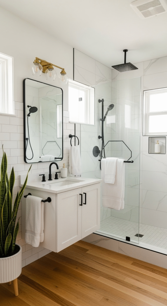 - Key Elements: Floating vanity, frameless shower, monochromatic accessories, hidden storage.