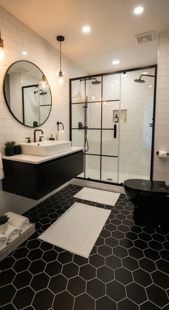 - Pro Tip: A light-colored bath mat on a black hex floor provides a soft landing and creates a beautiful visual contrast.