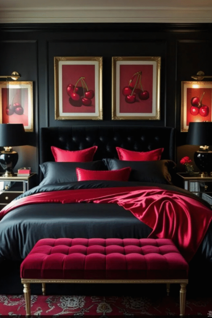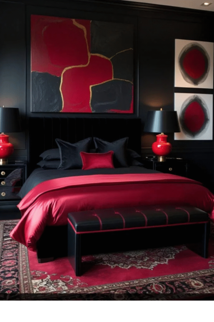 7. Black Bedroom With Deep Red and Dramatic Accents