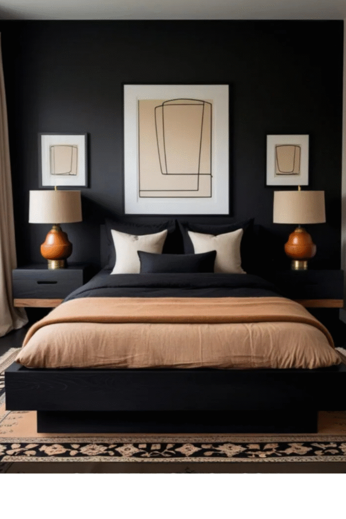 8. Black Bedroom With Warm Tan and Minimalist Accents