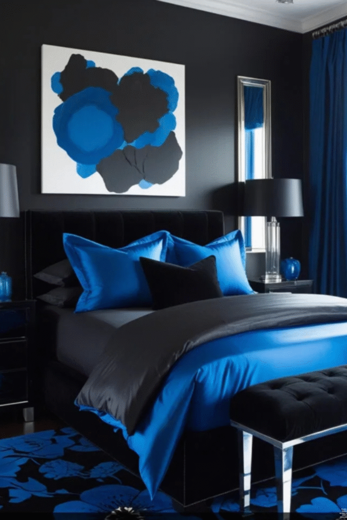 26. Black Bedroom With Deep Blue and Crisp Contrast