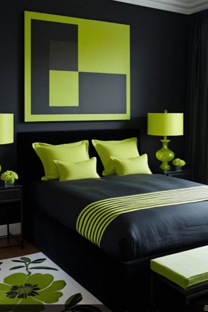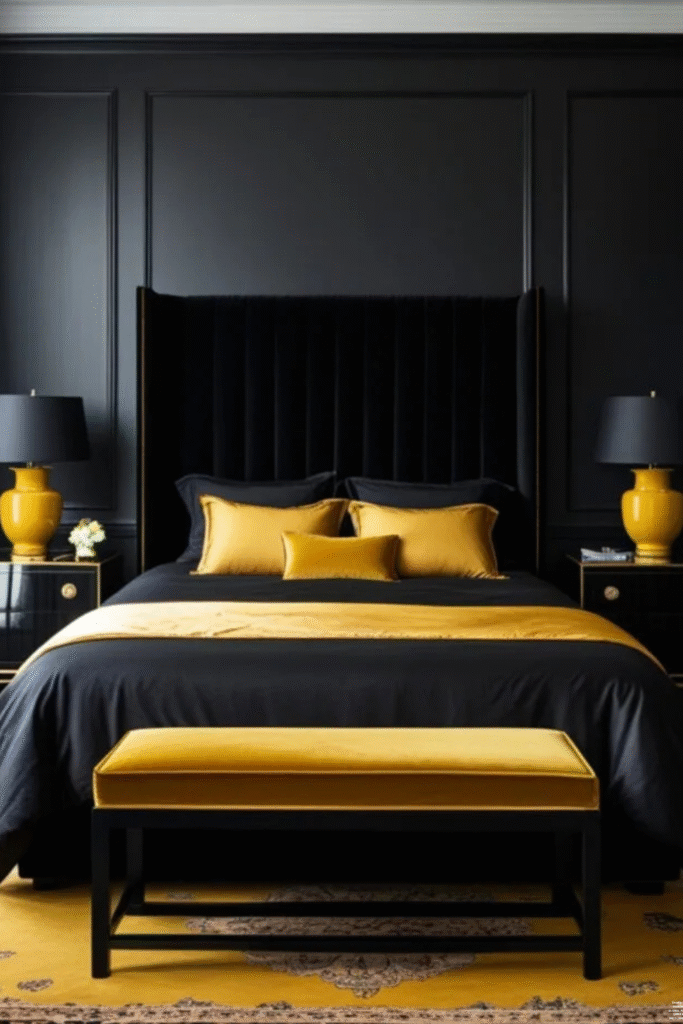 22. Black Bedroom With Mustard Yellow and Modern Contrast