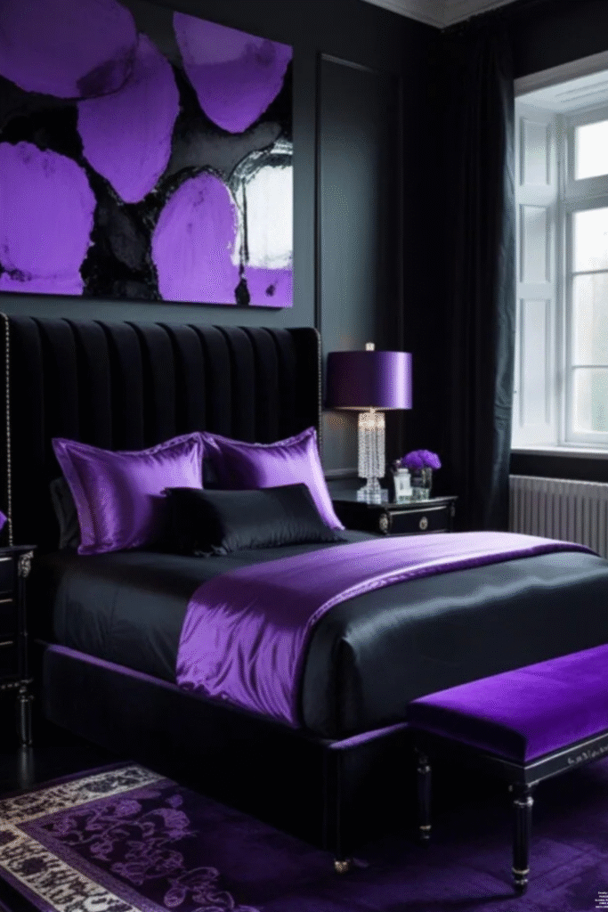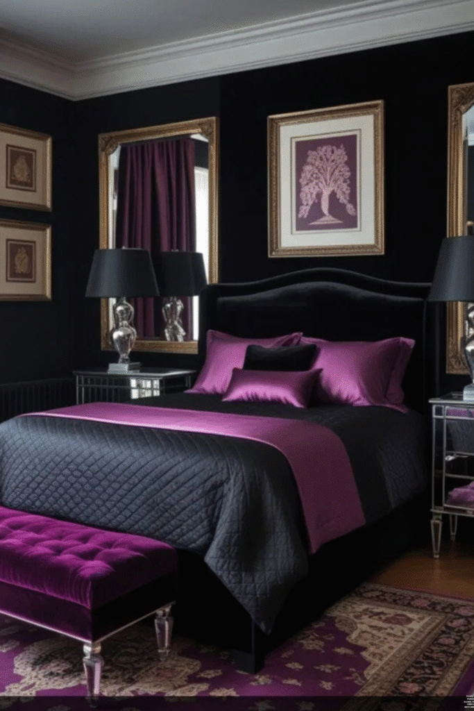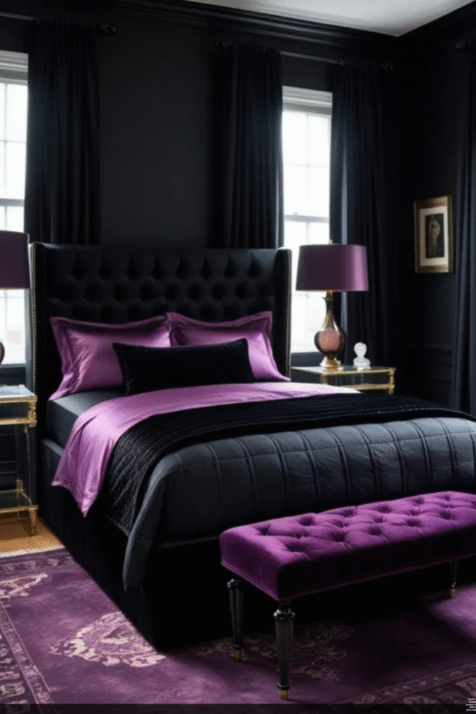 19. Black Bedroom With Dramatic Purple and Velvet Accents