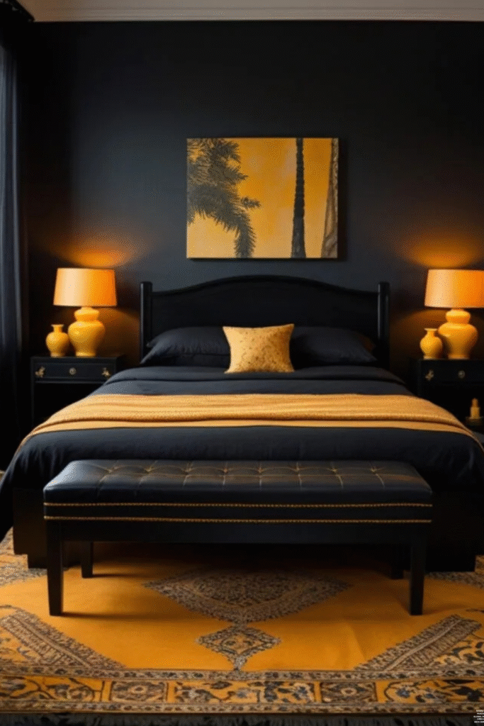 14. Black Bedroom With Warm Mustard Yellow Accents