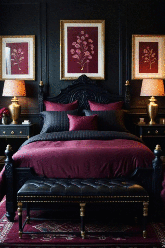 15. Black Bedroom With Deep Burgundy and Gold Accents