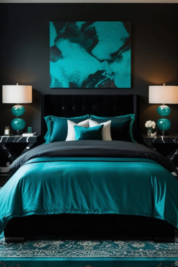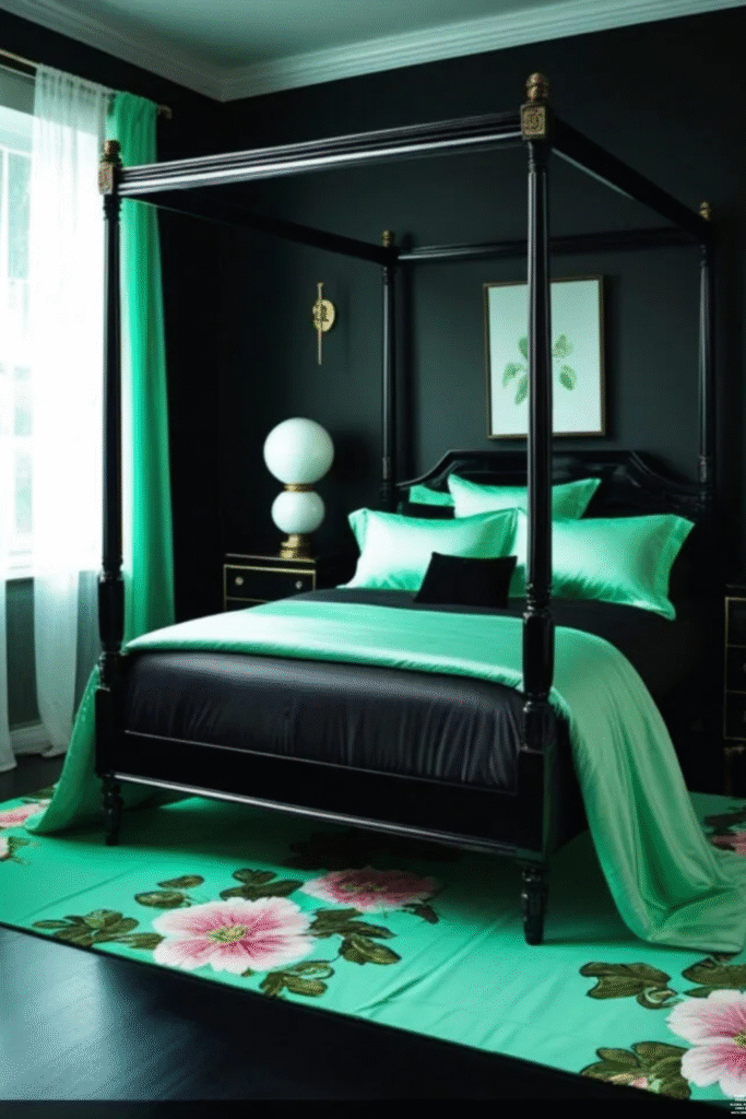 24. Black Bedroom With Mint Green and Romantic Canopy Style