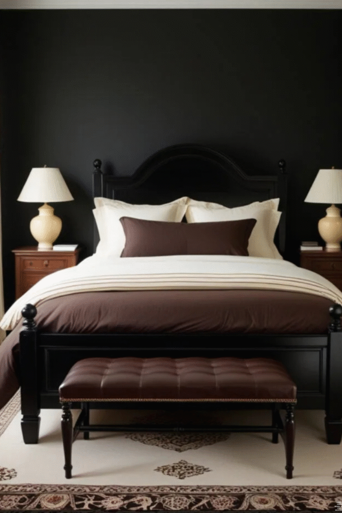 17. Classic Black Bedroom With Soft Cream and Brown Tones