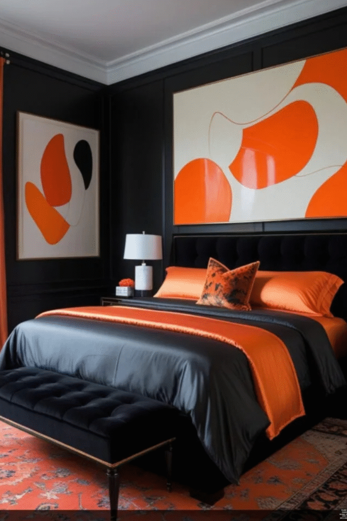 18. Black Bedroom With Bold Orange and Graphic Accents