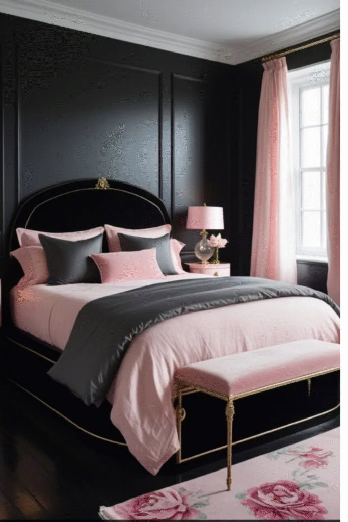21. Black Bedroom With Soft Blush Pink and Gold Accents