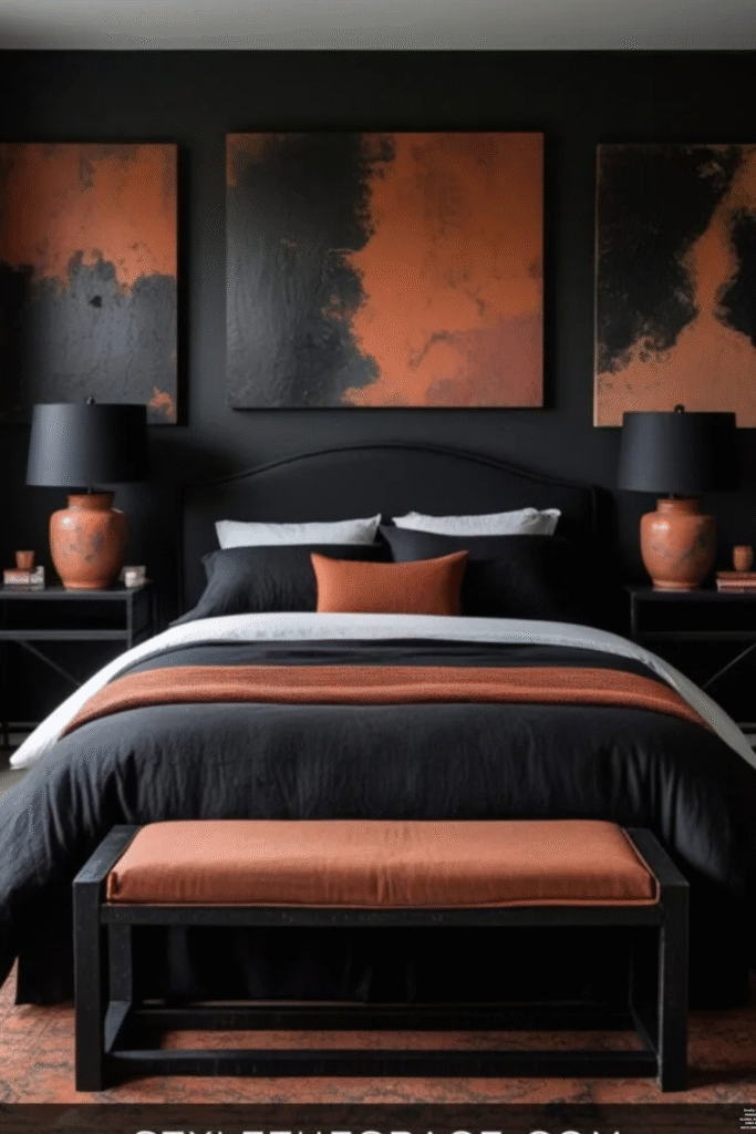 23. Black Bedroom With Warm Terracotta and Earthy Accents