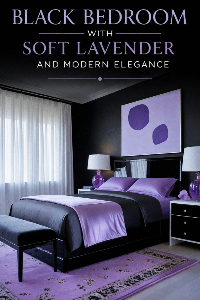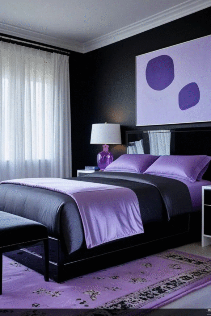 28. Black Bedroom With Soft Lavender and Modern Elegance