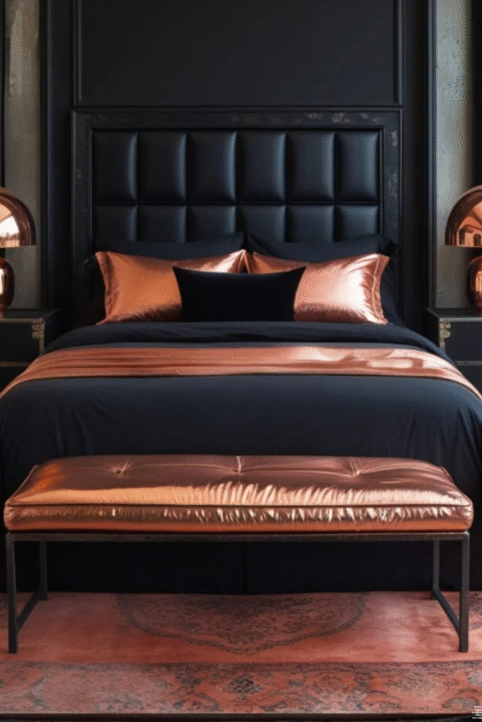 30. Black Bedroom With Warm Copper and Modern Luxe Style