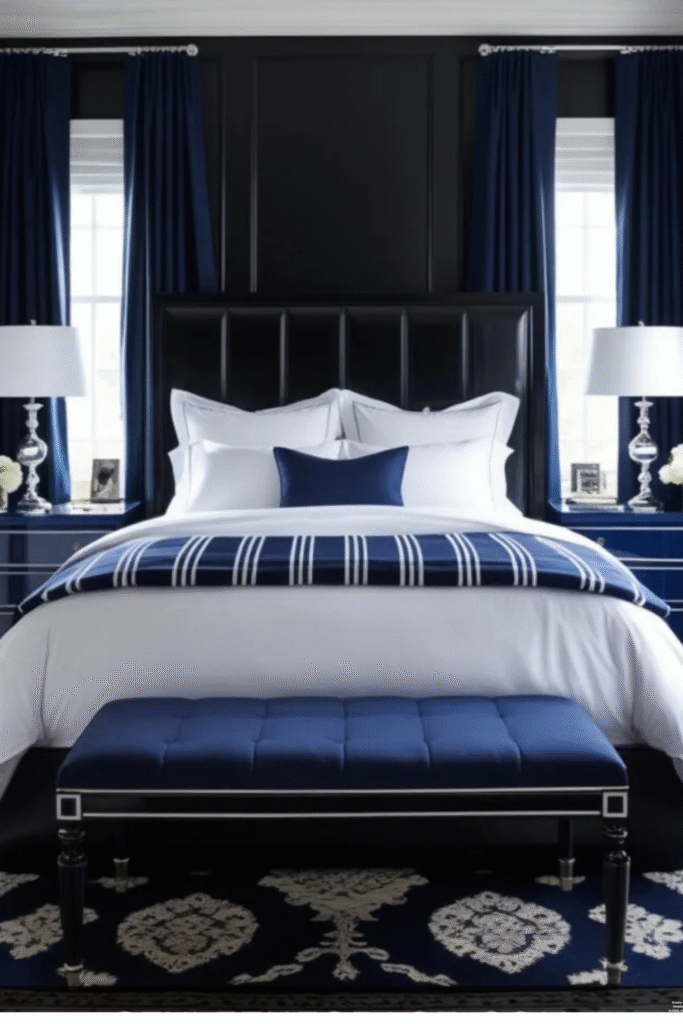 6. Black Bedroom With Navy Blue and Crisp White Layers