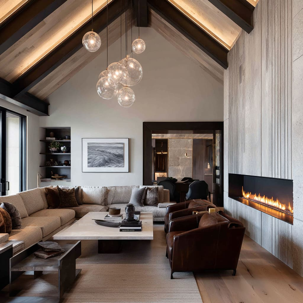 Lighting is meticulously engineered as a built-in material, not an afterthought. Linear glows are hidden behind hearth ledges, within shelves, and under benches to graze textures and define volumes. This eliminates the need for obstructive ceiling cans. When pendants are used, they are minimal clusters (alabaster spheres, glass orbs) hung low to define space without blocking sightlines, creating intimacy.
