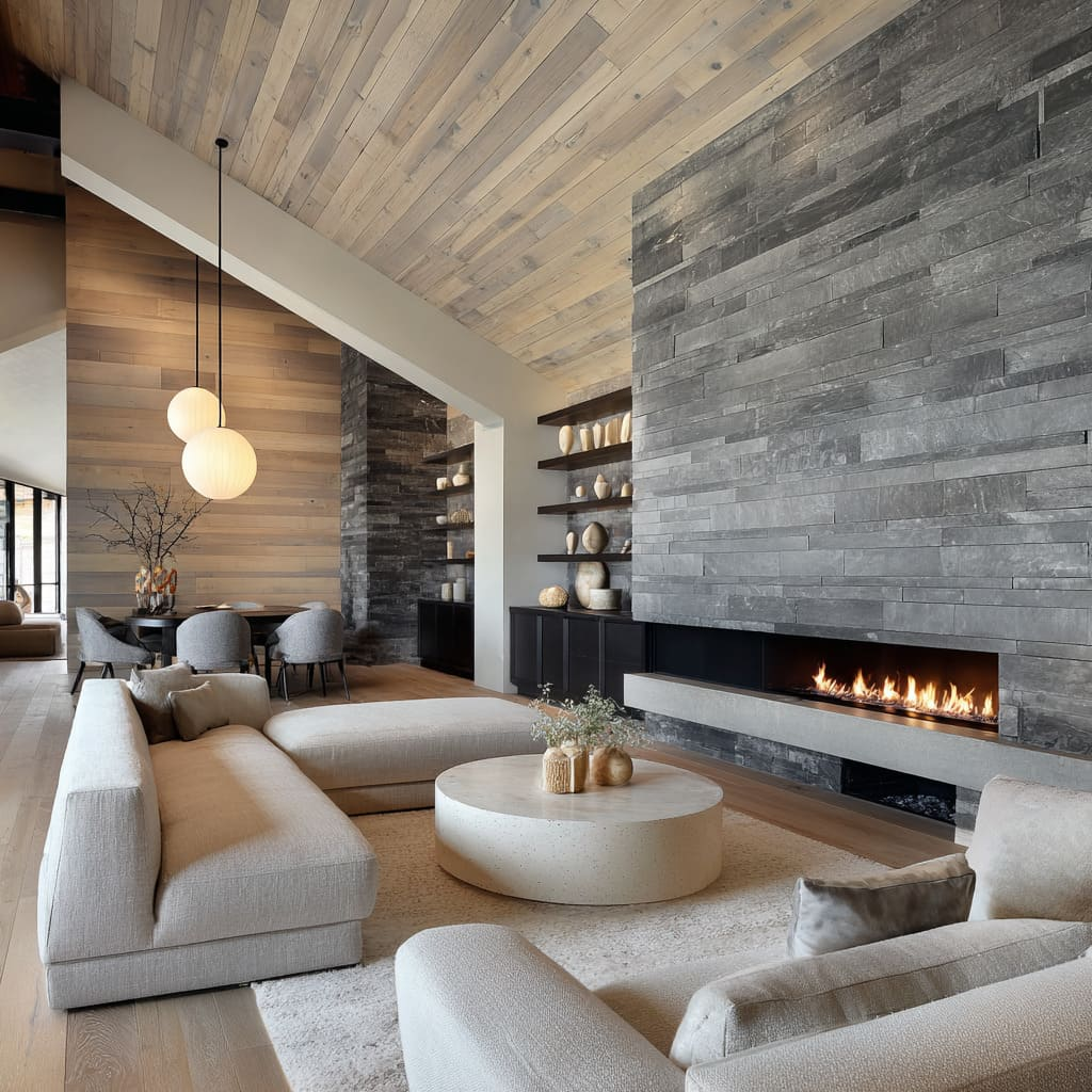 Gone is the bulky, roaring stone hearth as a focal point. In its place is the long, low ribbon fireplace. This horizontal line acts as the room’s calm baseline, a linear element where flame becomes an integrated design feature. The surrounding material—often smooth travertine, fluted limestone, or split-face slate—is treated as a monolithic, sculptural wall, catching light and shadow with quiet drama.
