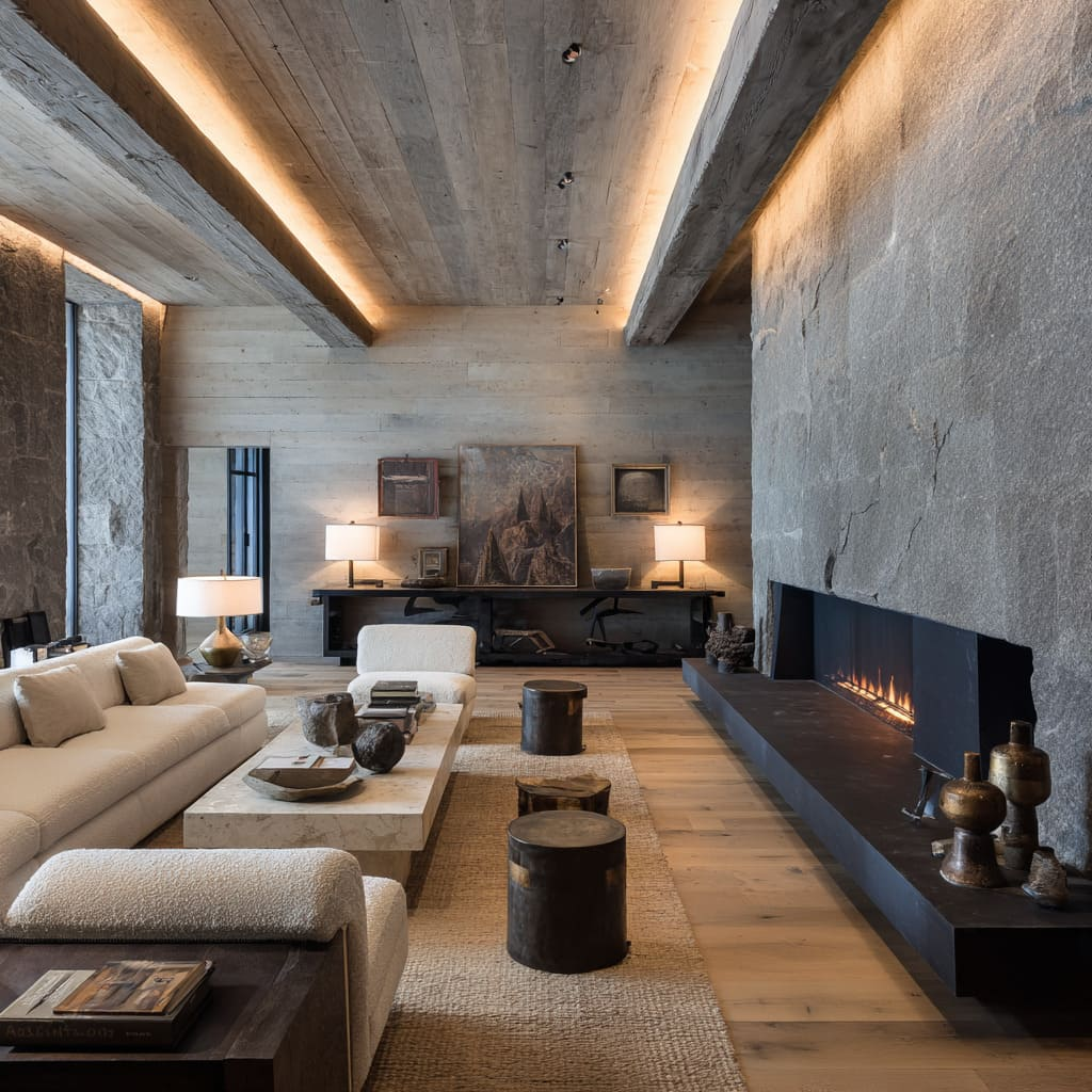 A: Absolutely. The principles are adaptable. Focus on incorporating one or two core elements—like a linear electric fireplace, a textured plaster wall, a palette of natural neutrals with sharp black accents, and furniture with soft, rounded forms. The style is about an attitude of textured, structured warmth, not a literal location.